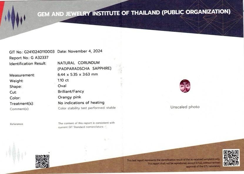 This 1.10-carat natural Padparadscha sapphire displays the rarest fusion of delicate pink and vivid orange, the defining hue of Ceylon’s most coveted sapphire variety. Certified by the Gem and Jewelry Institute of Thailand (GIT) as unheated, it retains its pure, natural beauty — untouched by enhancement.