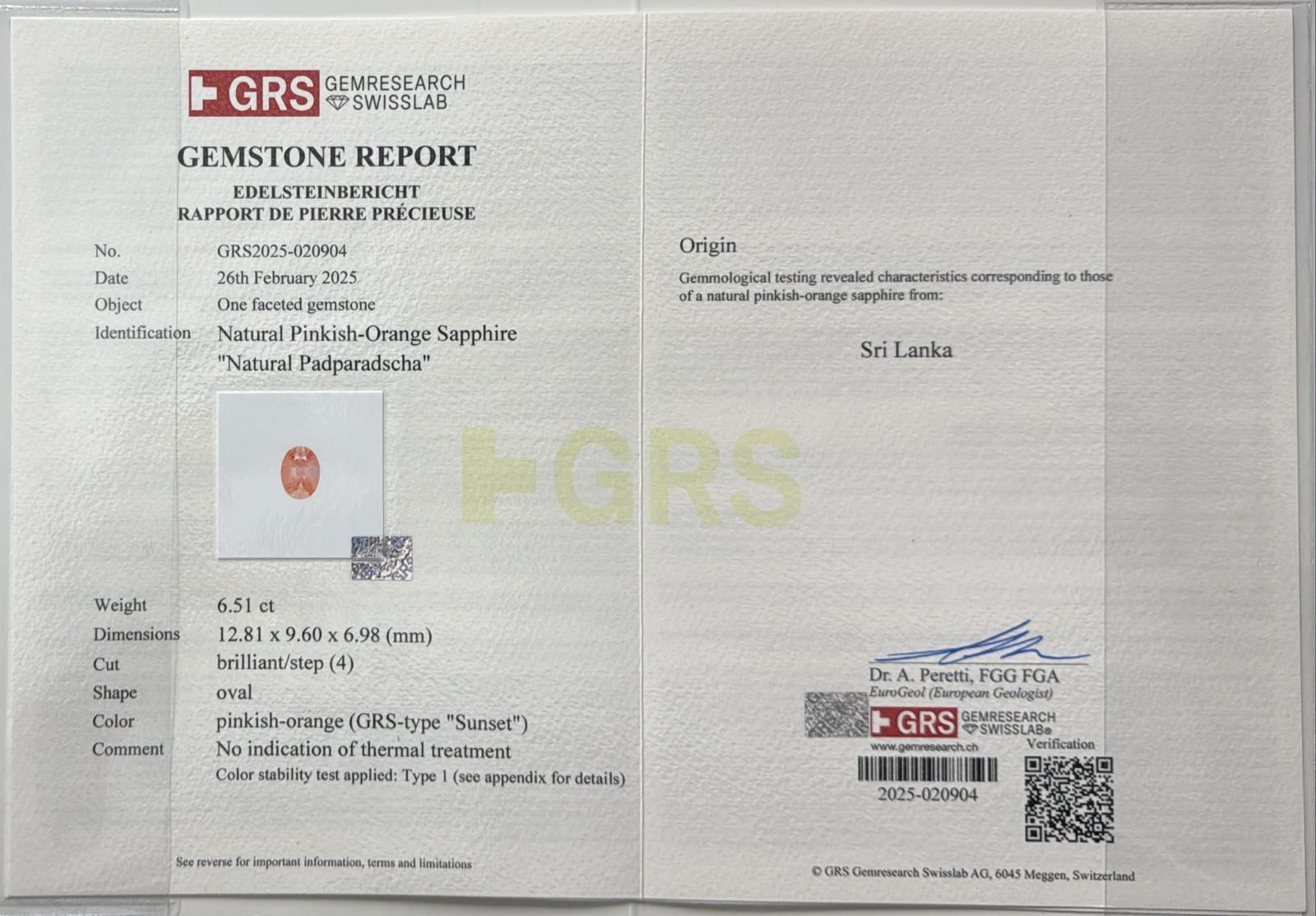 Originating from Sri Lanka, the birthplace of the world’s most famous Padparadscha sapphires, this gem is completely unheated, with GRS confirming no indication of thermal treatment and Type 1 color stability — meaning its hue is both naturally formed and enduring.